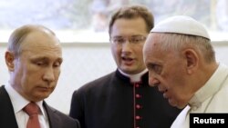 Франциск и президент РФ общались больше часа и обсуждали в том числе кризис в Украине. Путин получил от папы старинную медаль с изображением ангела, "приносящего мир и справедливость". Ответным подарком российской делегации стало панно с изображением храма Христа Спасителя и несколько томов православной энциклопедии.
